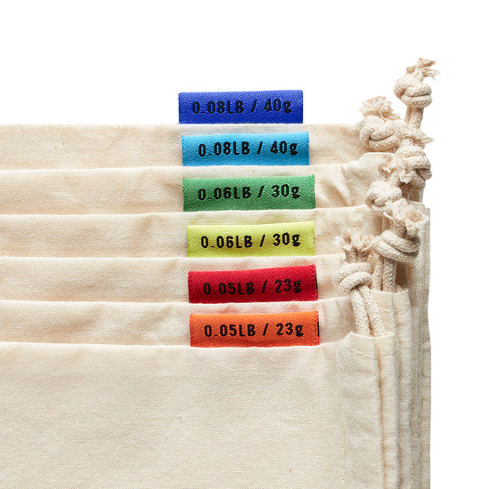 The bag's tare weight is stitched on the back of brightly colored labels so the cashier can easily find it. - The tare is given in both English and metric units so our bags can be used anywhere in the world.
